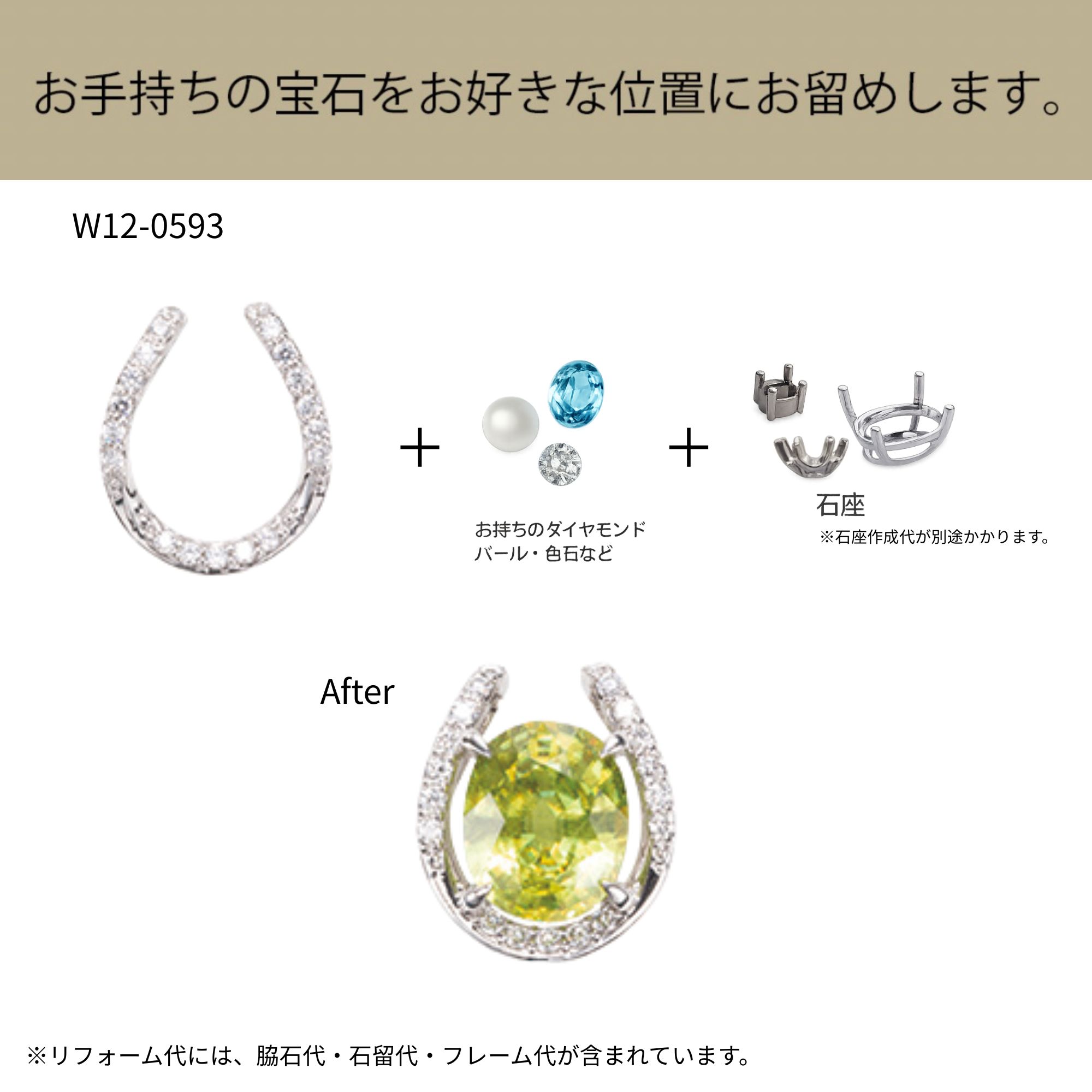 こちらの金額は「フレーム代・脇石代・石留代」込みの価格です。(チェーンは別売りです。)